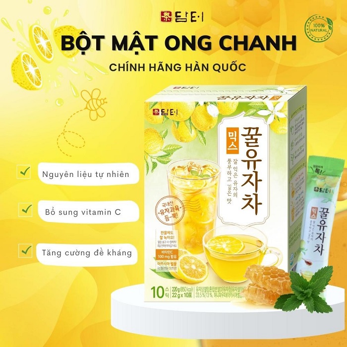 - Bột mật ong chanh Hàn Quốc Damtuh vừa có tác dụng cung cấp vitamin C, tăng cường sức đề kháng, vừa là nước uống giải khát lý tưởng cho những ngày nắng nóng.